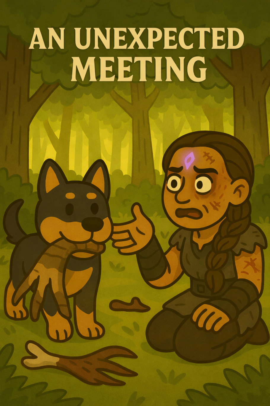 Auf der Flucht durch den Wald trifft eine verletzte junge Hexe auf einen ungewöhnlichen Begleiter – einen scheinbar harmlosen Hund. Doch als ein Verfolger sie angreift, zeigt sich schnell, dass in dem Tier mehr steckt, als es zunächst scheint. Mit unerwarteter Entschlossenheit stellt sich der Hund dem Angreifer entgegen und rettet der Hexe das Leben. Während ihr Feind flieht, bleibt die junge Hexe verwirrt zurück – denn ausgerechnet der Hund, den sie für eine einfache Kreatur hielt, hat sie beschützt. Ein unerwartetes Bündnis beginnt.
